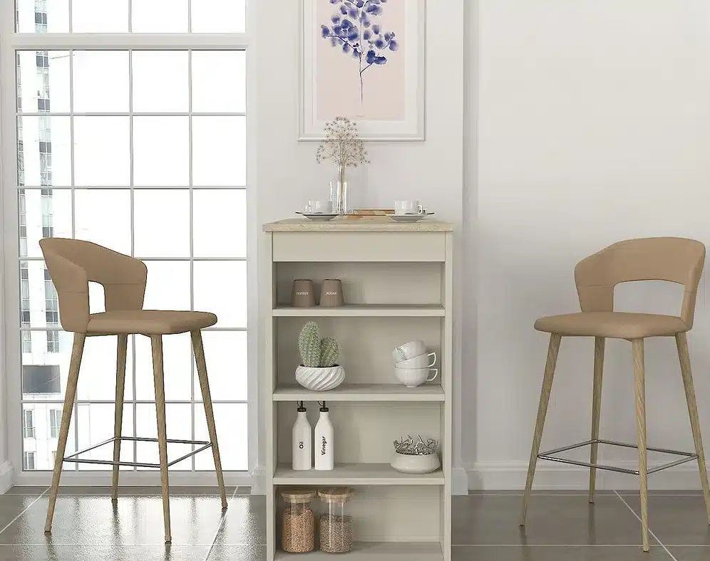 שולחן בר עם מדפים בעיצוב אלגנטי ופונקציונלי, משלב משטח עליון בגימור דמוי שיש עם גוף בגוון קרם אבן. השולחן מושלם למטבחים, פינות אוכל ומשרדים.