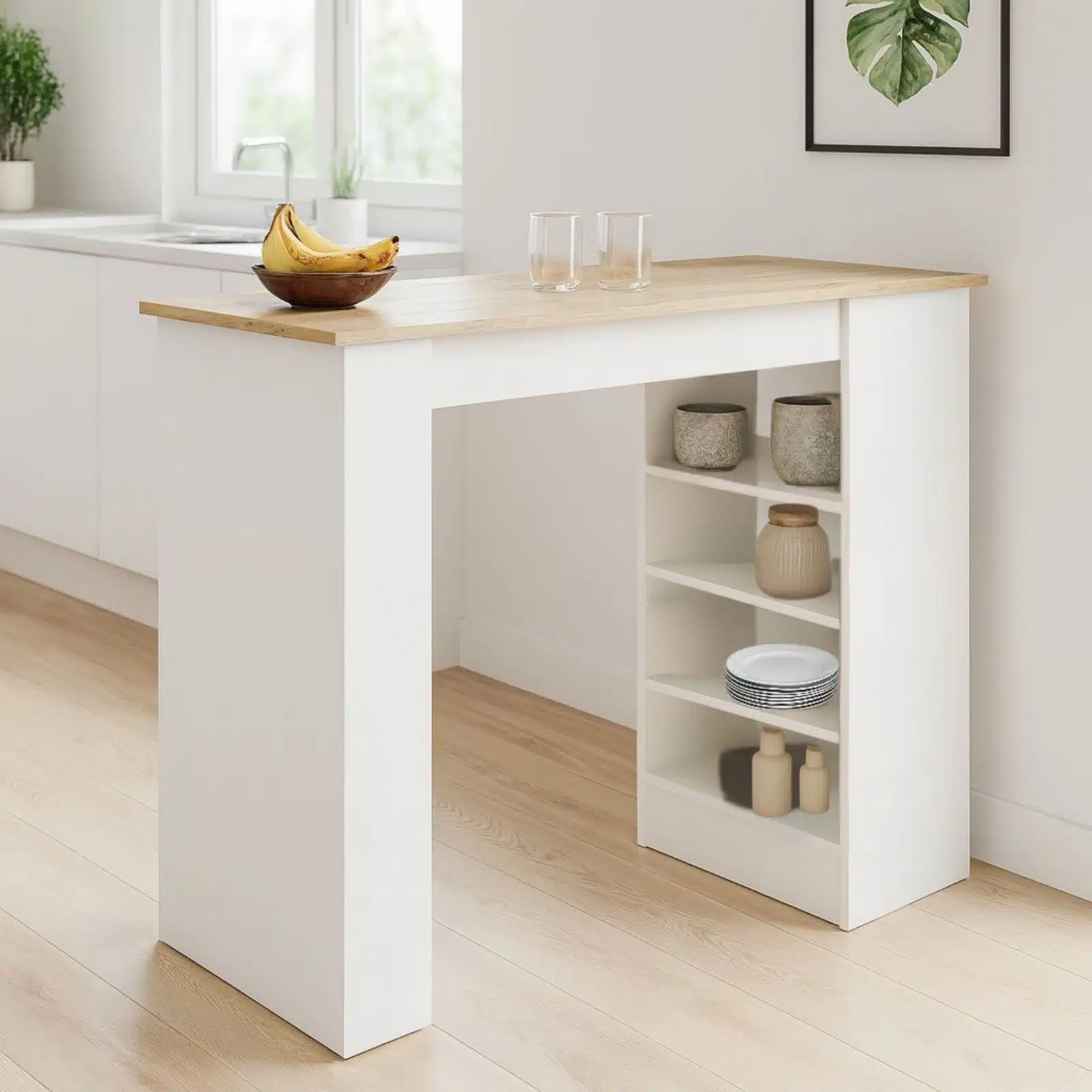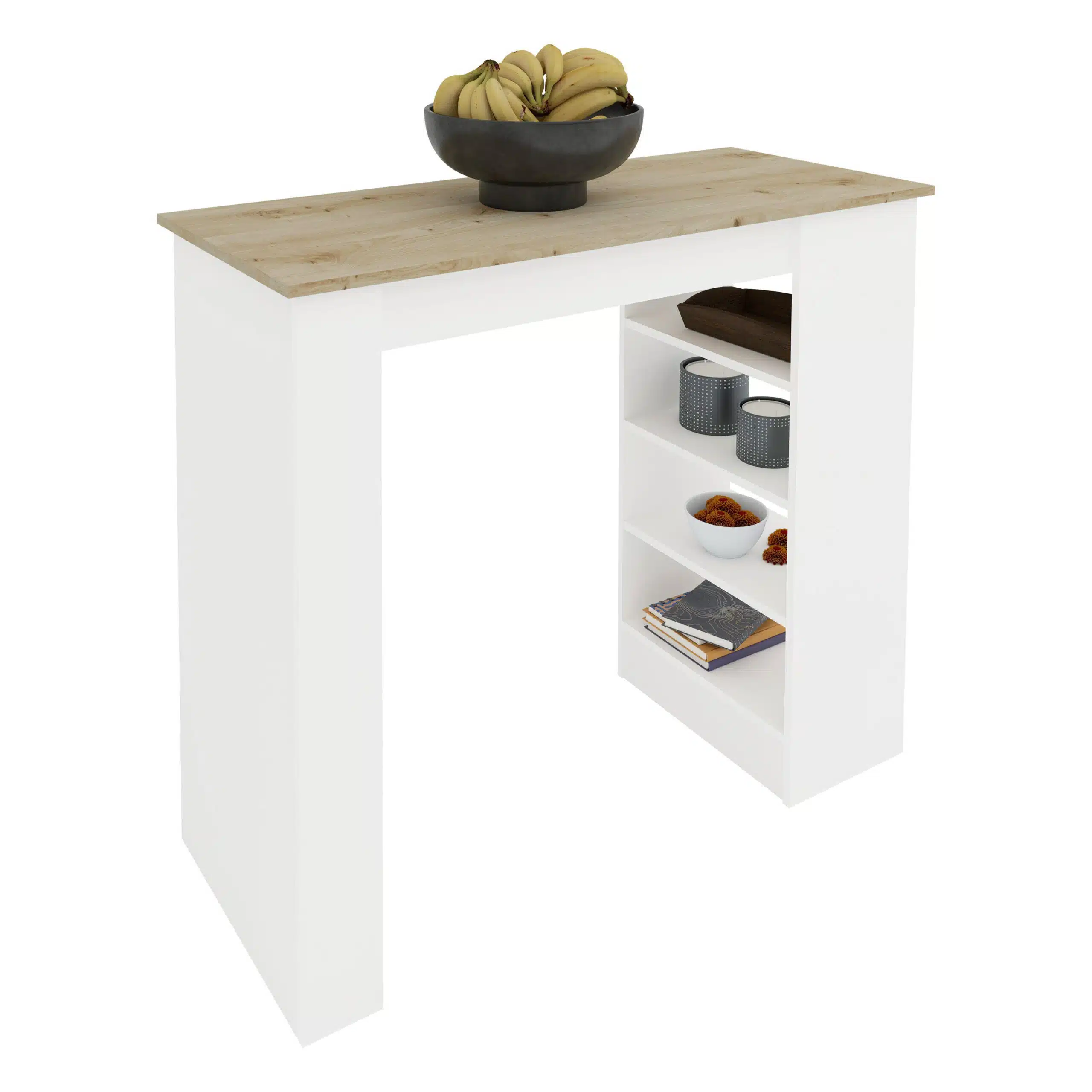 שולחן בר למטבח עם מדפים בעיצוב מודרני ונקי המשלב פלטה עליונה בגוון אלון חמים עם מבנה לבן מבריק. מושלם לשימוש כאי מטבח, דלפק הגשה, או שולחן אוכל גבוה לבית מודרני.