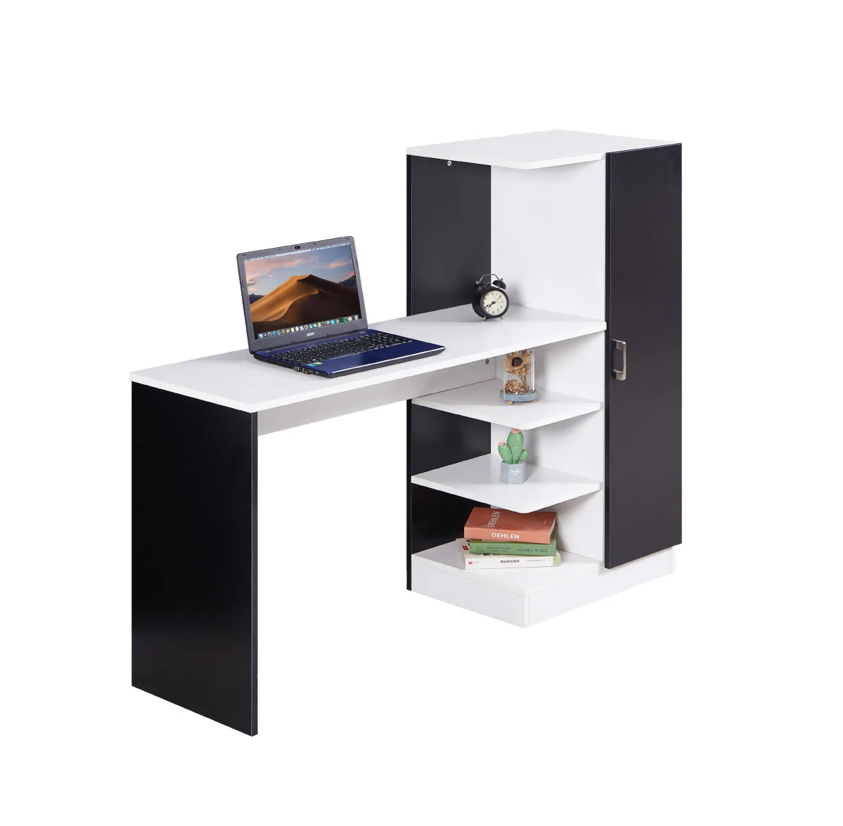 שולחן כתיבה עם ספרייה משולבת בעיצוב מודרני ונקי, המשלב משטח עבודה רחב עם יחידת אחסון מרשימה. מושלם למשרד ביתי, חדר תלמיד או כל חלל שדורש פונקציונליות מקסימלית.
