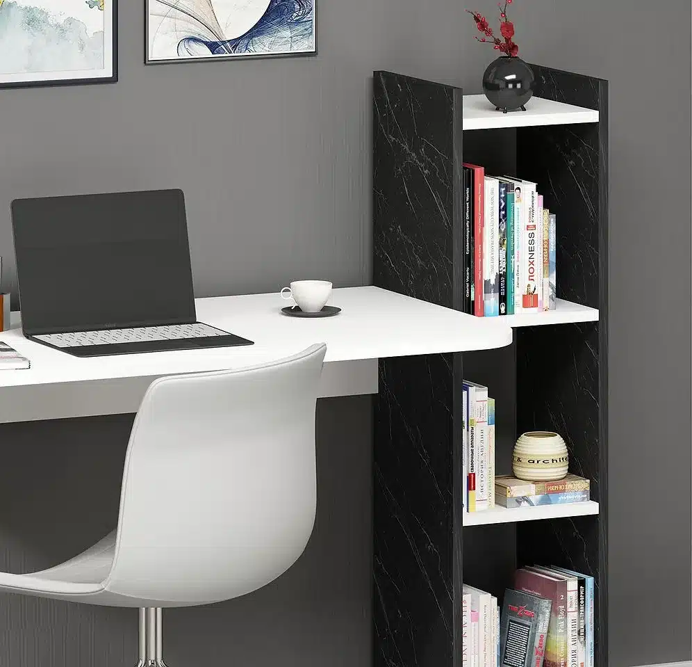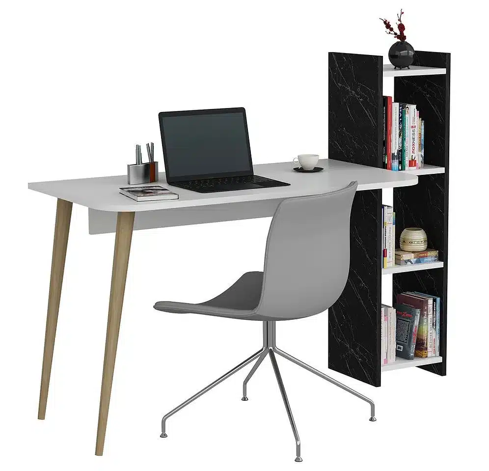 עיצוב ייחודי: משטח עבודה לבן בשילוב ספריית אחסון בגימור שחור דמוי שיש ורגלי עץ בסגנון סקנדינבי. 4 מדפים פתוחים לאחסון ספרים וציוד.