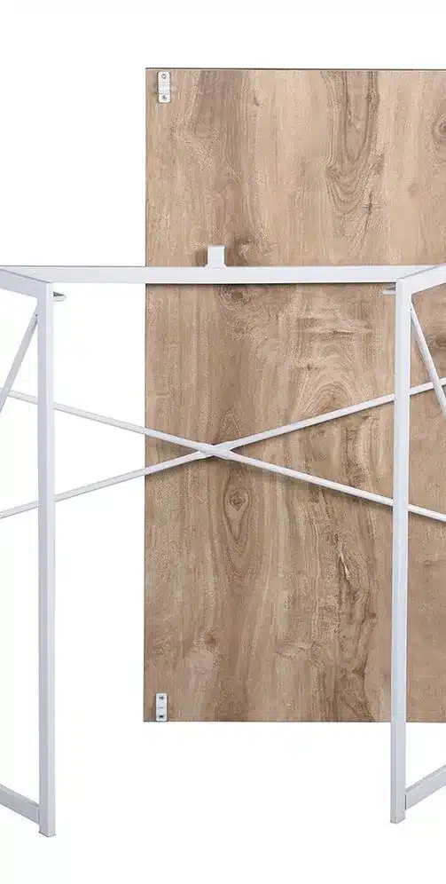 העיצוב המודרני והנקי של שולחן הכתיבה משלב קווים מינימליסטיים עם נוכחות חזקה בחלל. פלטת השולחן בגוון עץ אורן טבעי יוצרת אווירה חמימה ונעימה, בעוד מסגרת המתכת הלבנה מוסיפה נגיעה עכשווית וקלילה. השילוב בין החומרים יוצר מראה סקנדינבי אלגנטי שמשתלב בקלות בכל סגנון עיצוב פנים.
