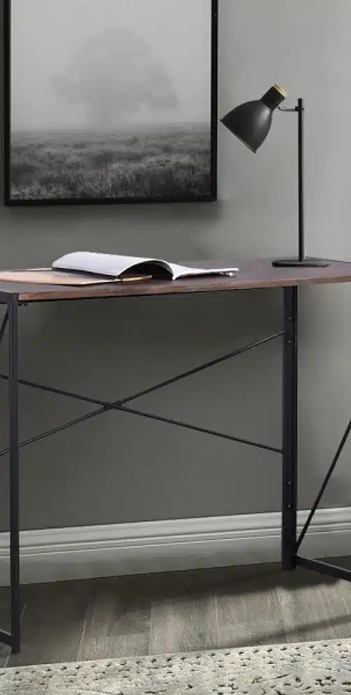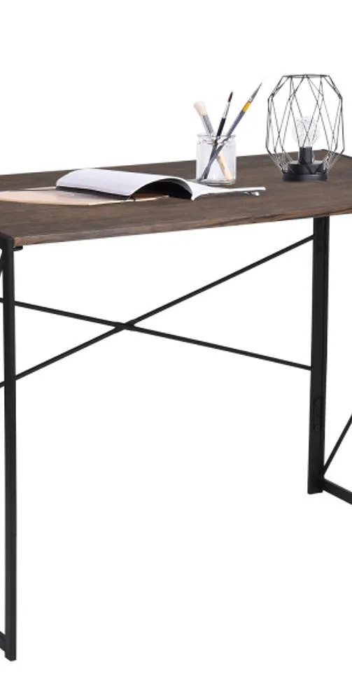 שולחן כתיבה מתקפל בעיצוב תעשייתי אלגנטי המשלב פלטת עץ בגוון אגוז כהה עם מסגרת מתכת שחורה. הפתרון המושלם לעבודה מהבית, לימודים או כפינת יצירה.