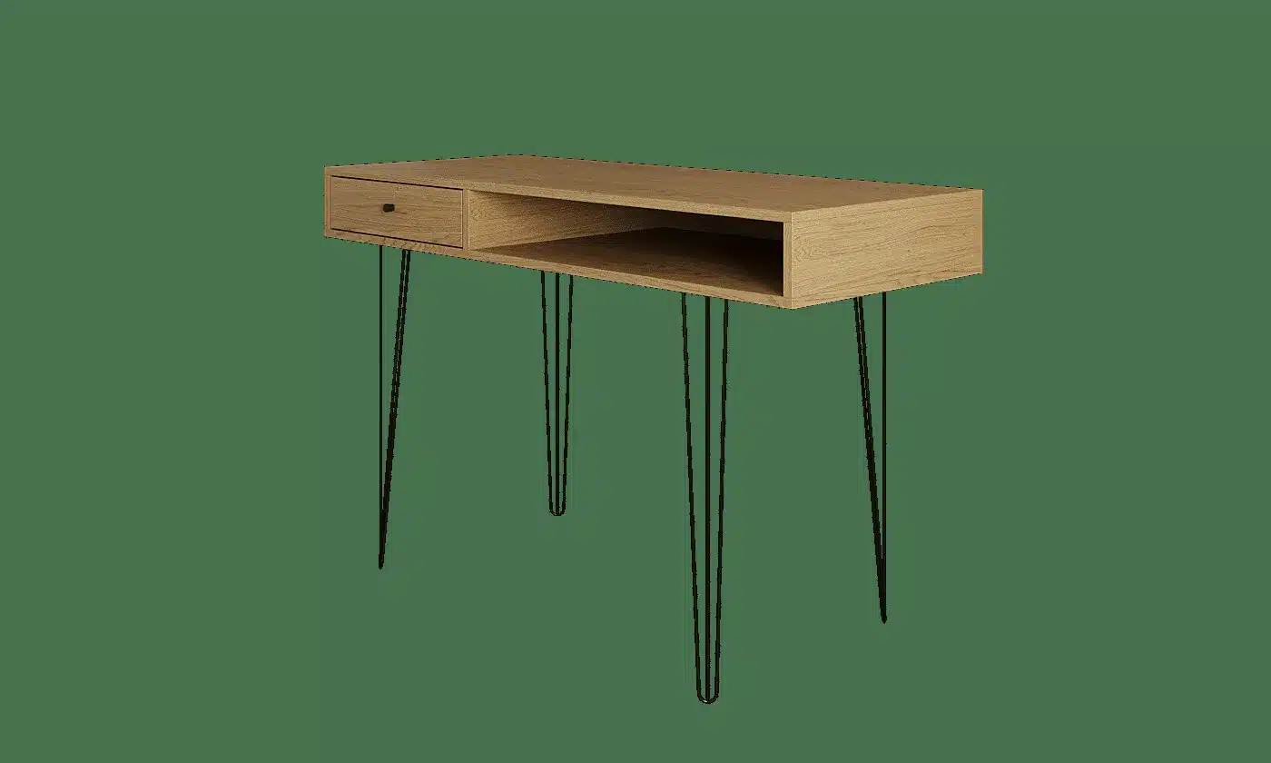 השולחן הוא הפתרון האידיאלי ליצירת פינת עבודה מעוצבת ומזמינה בבית או במשרד. השולחן משלב בין מראה עץ יוקרתי לרגלי מתכת דקיקות ויציבות בסגנון "סיכת ראש" (Hairpin Legs).