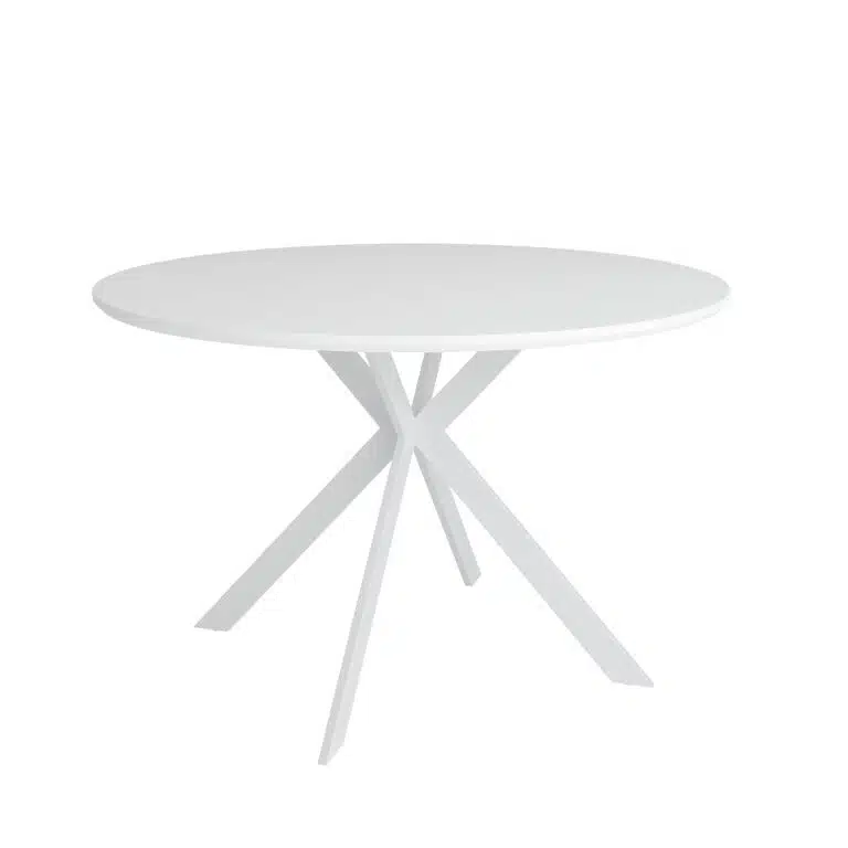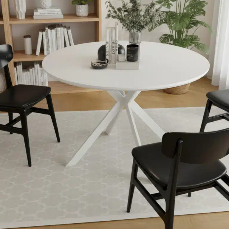 שולחן אוכל עגול בקוטר 120 ס"מ המשלב משטח מלמין יוקרתי עם בסיס רגלי מתכת מושחרות בעיצוב כוכב ייחודי. מתאים לישיבה נוחה של עד שישה סועדים.
