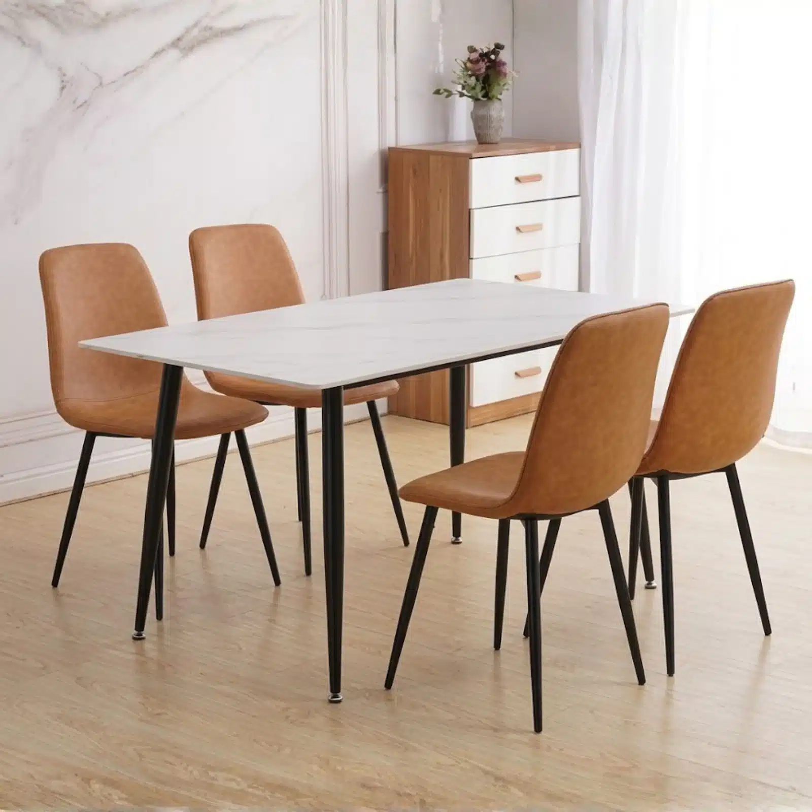 העיצוב המודרני והנקי של שולחן אוכל קרמיקה דמוי שיש לבן מתאפיין בפלטה בגוון שיש לבן עם עורקים עדינים המעניקים מראה טבעי ואלגנטי. השולחן נשען על רגלי מתכת שחורות מעוצבות שמוסיפות יציבות גבוהה ומראה עדכני המשתלב בקלות עם מגוון סגנונות עיצוב.