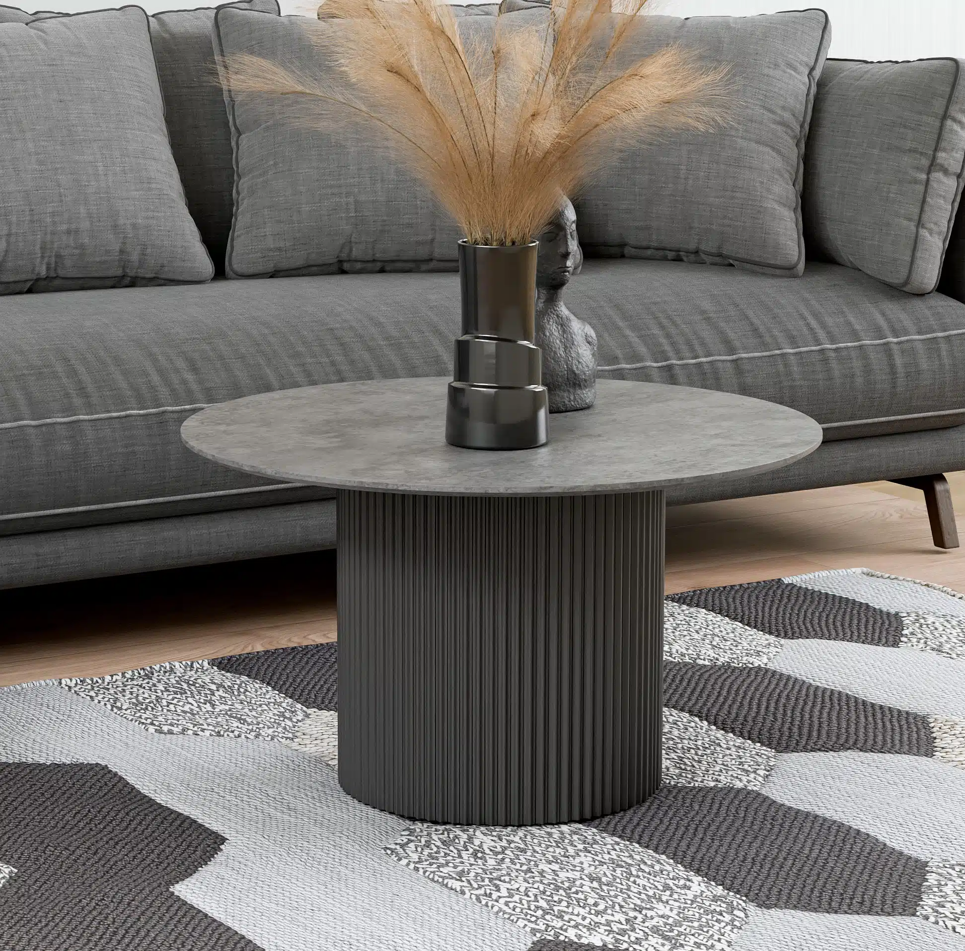 שולחן סלון מעוצב המשלב אלגנטיות עם פרקטיות. הרגל הגלילית המפוסלת בקווים אנכיים יוצרת מראה ארכיטקטוני ייחודי שמושך את העין.