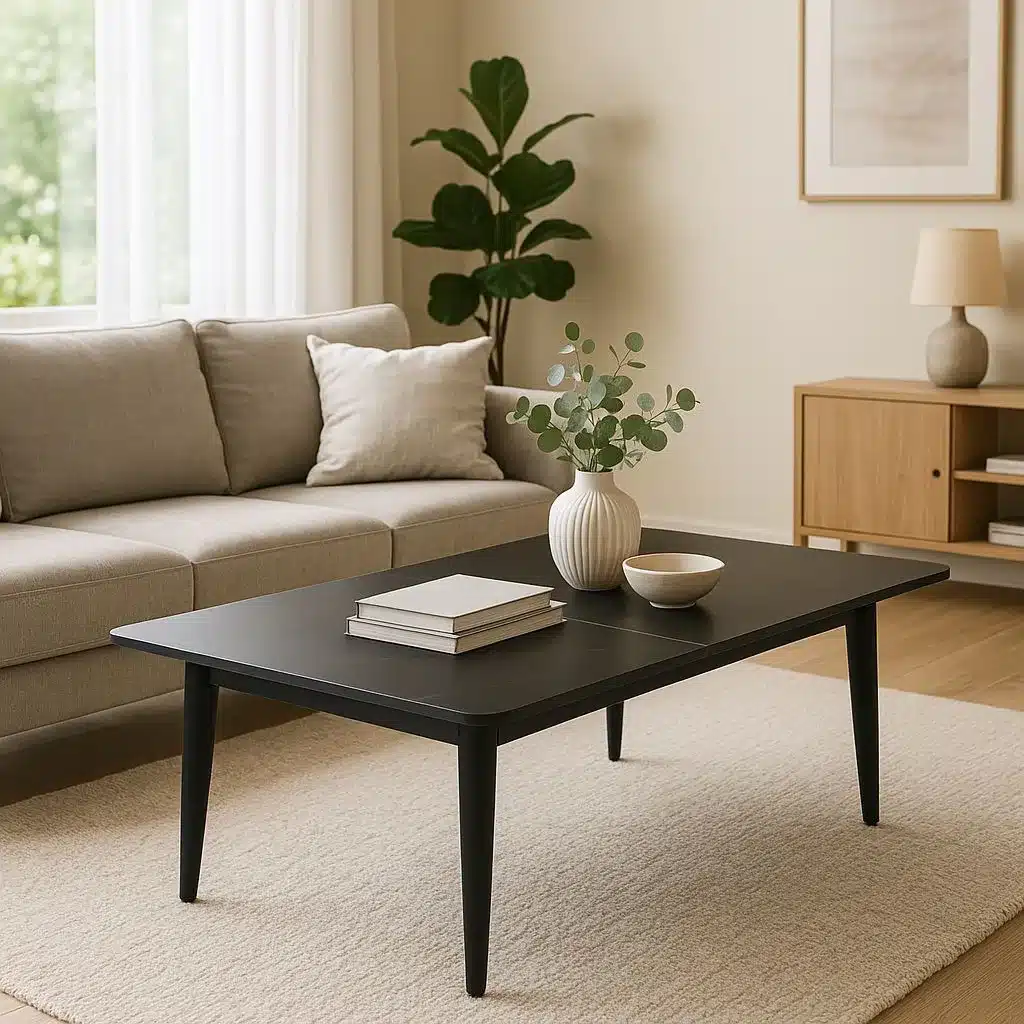 - ניגודיות צבעים: שלבו את השולחן השחור עם שטיח בגווני שמנת או אפור בהיר ליצירת מראה יוקרתי ומודגש.