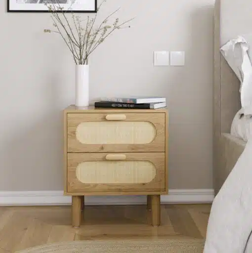 שידת לילה בעיצוב כפרי סקנדינבי , ע*שויה מעץ מתעוש עם חיפוי מלמין יצוק בגימור מושלם משולב עם דמוי ראטן שמביא חמימות ומראה נעים שישתלב היטב לצד מגוון סגנונות ועיצובים. לשידה שני מגירות נוחות לאחסון רב תכליתי .