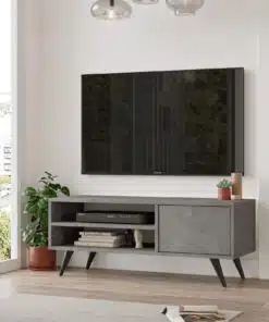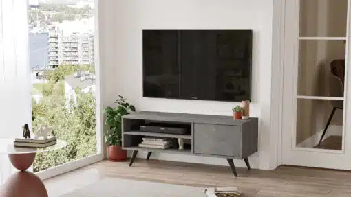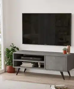 מזנון לסלון בצבע אפור בעיצוב קלאסי עם קלאפת אחסון ומדפים פתוחים עשוי מעץ מתועש עם חיפוי מלמין יצוק