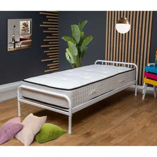 מיטה ממכת אל חלד חזקה ויציבה בצבע לבן , מעוצבת בסגנון נקי וקווים ישrרים,