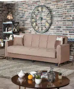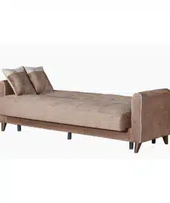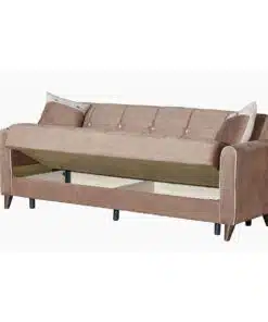 ספה נפתחת עם ארגז מצעים בבד חום בהיר