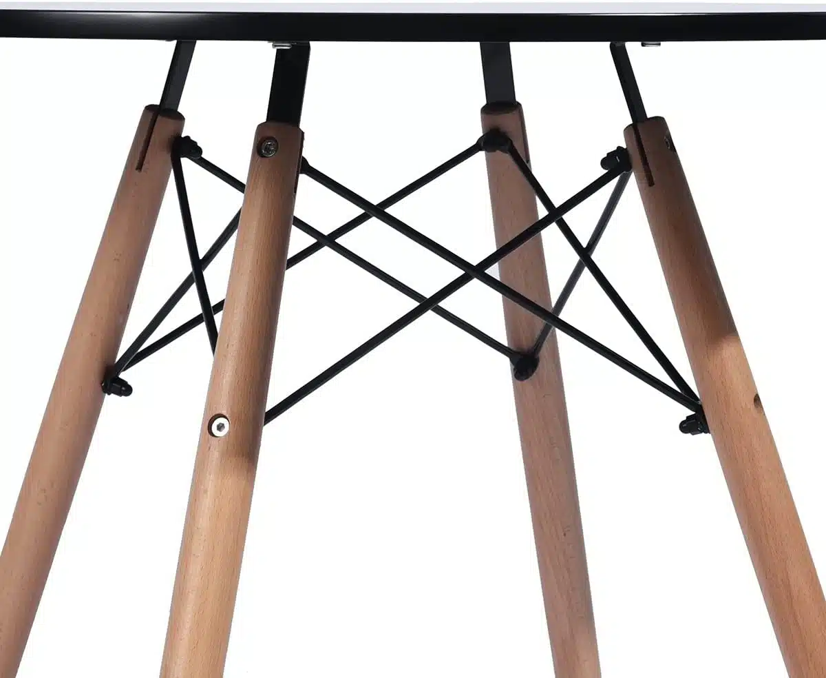 שולחן פינת אוכל עגול בצבע שחור משולב עם רגלי עץ, פלטת השולחן עשויה מ-MDF עם חיפוי מלמין יצוק בצבע שחור.