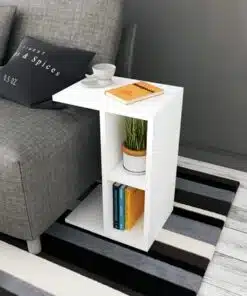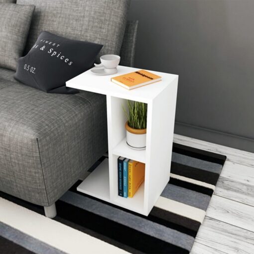 שולחן צד קטן לסלון עם שני מדפי אחסון עשוי מאם די אף עם חיפוי מלמין בצבע לבן.