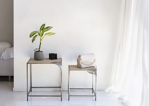 זוג שולחנות מברזל ממתכת מוברשת , פינות השולחן בעיצוב מיוחד נוטפות כלפי מטה.
