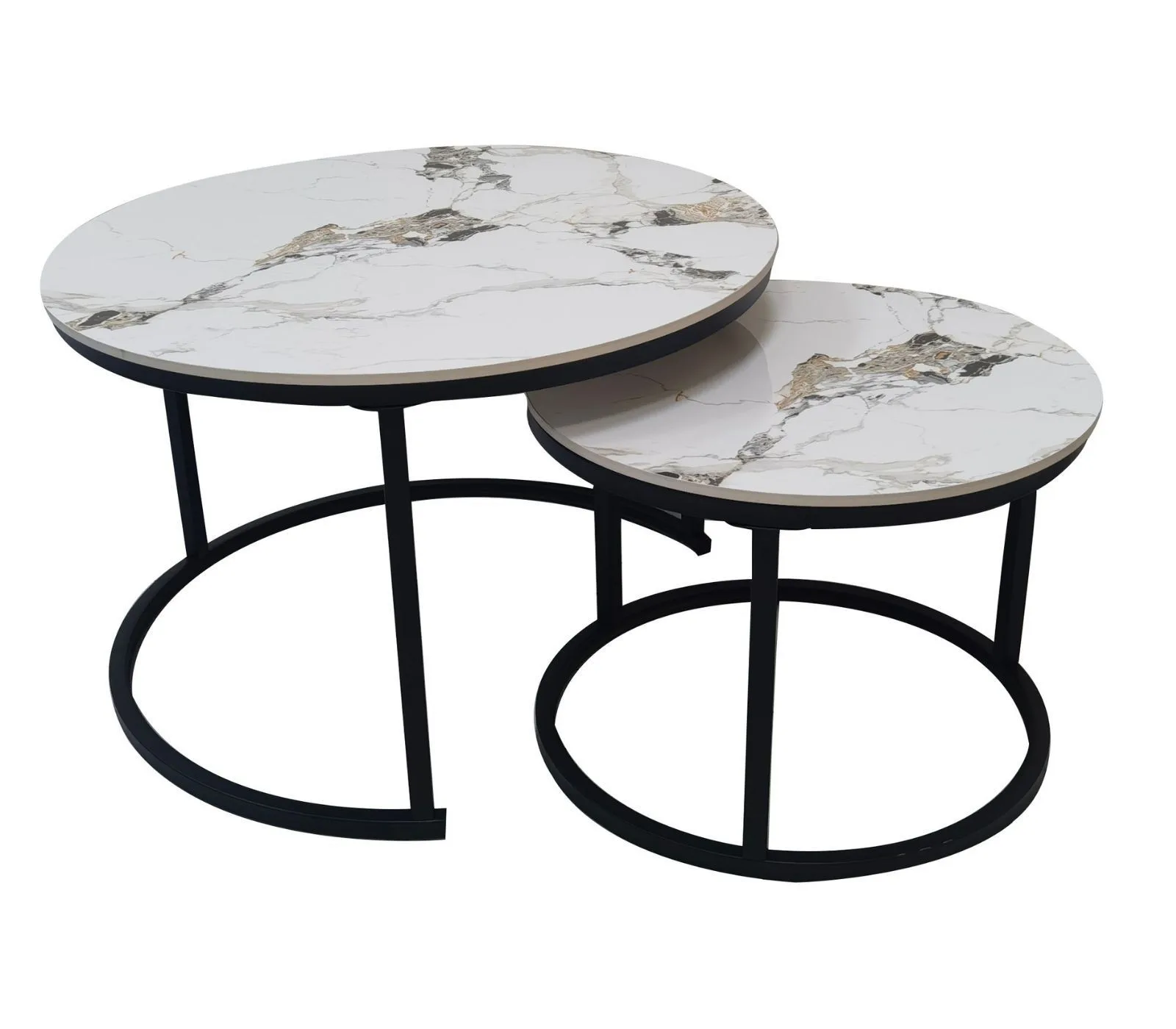 סט זוג שולחנות קפה בעיצוב נקי ויוקרתי, הכולל פלטות קרמיקה איכותיות במראה שיש לבן מבריק. השולחנות מעניקים מראה יוקרתי לכל חלל מגורים ומתאימים במיוחד לעיצוב פנים עכשווי.