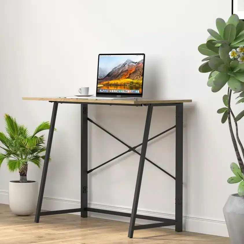 שולחן עבודה מתקפל בעיצוב תעשייתי מודרני המשלב עץ בגוון אלון טבעי ומתכת מושחרת. השולחן מושלם לדירות קטנות, משרדים ביתיים וסטודנטים.