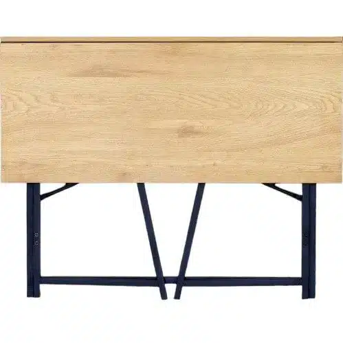 עיצוב תעשייתי: שילוב אלגנטי של משטח עץ אלון חם עם מסגרת מתכת שחורה חזקה. מנגנון קיפול פשוט ונוח לשימוש יומיומי.