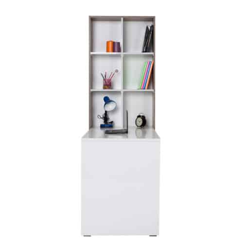 שולחן כתיבה משולב עם ספרייה פתוחה לאחסון בצבע לבן. השולחן עשוי משבבית דחוסה בחיפוי מלמין בתקן אירופאי.
