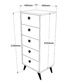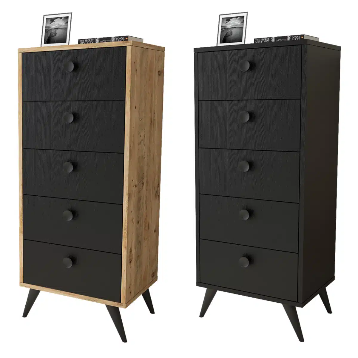 שידת מנירות גובה וצרה בצבע שחור , בעלת 5 מגירות גדולות ונוחות לאחסון , תשתלב היטב בחדר השינה, בכניסה לבית או בסלון. השידה עשויה מעץ מתועש עם חיפוי מלמין יצוק בצבע שחור משלוב אורן