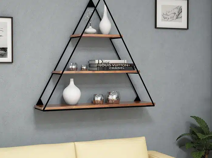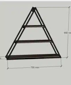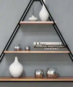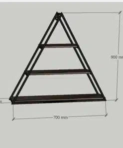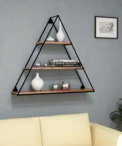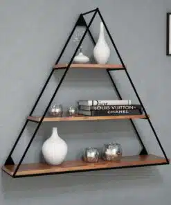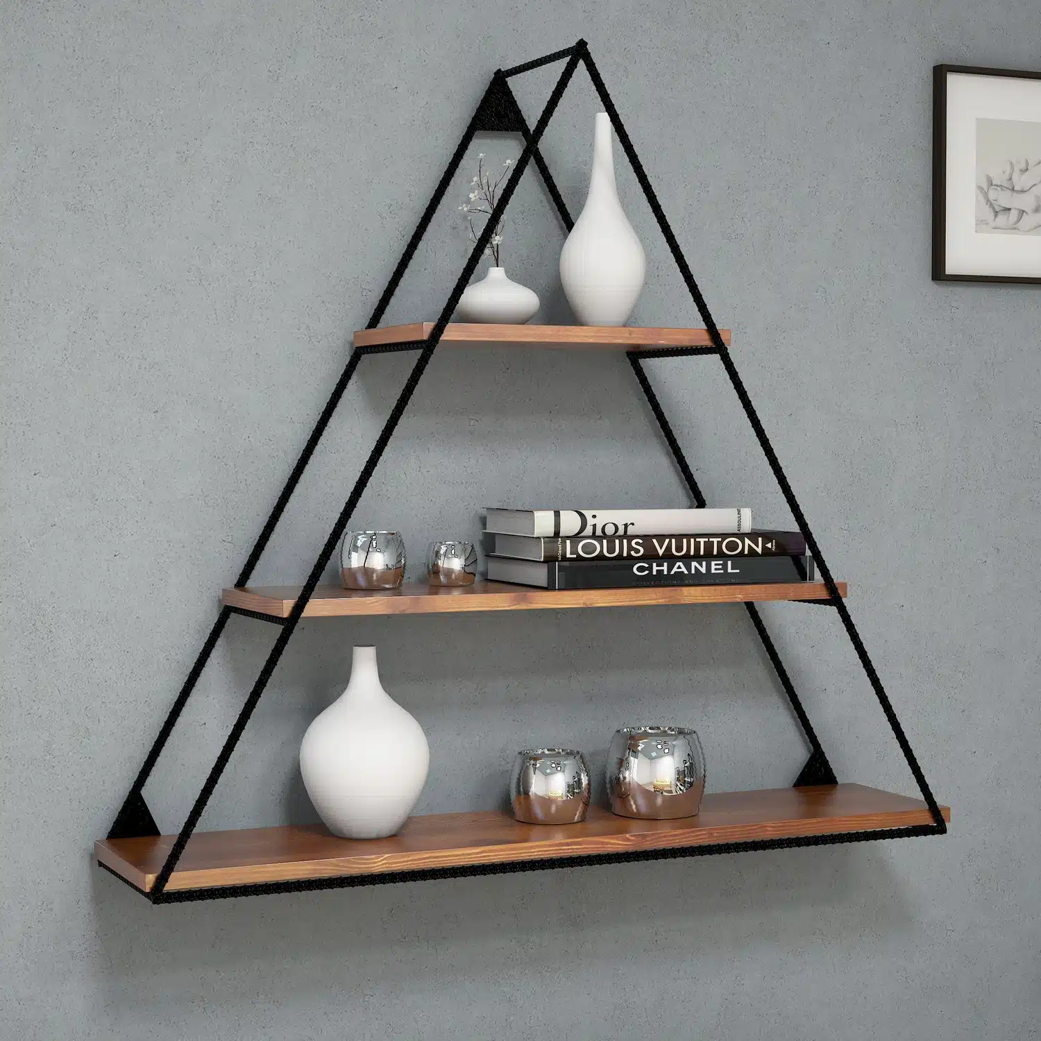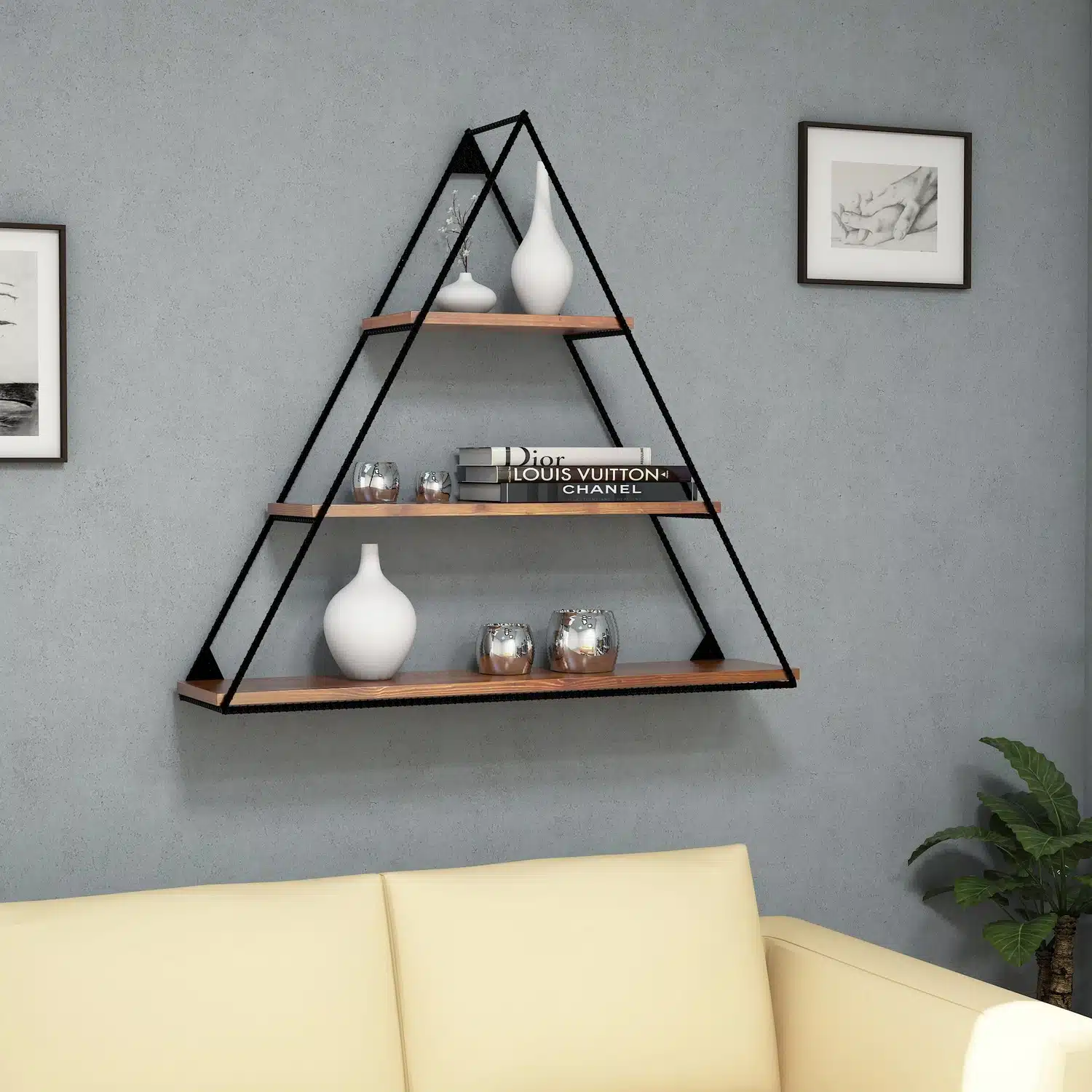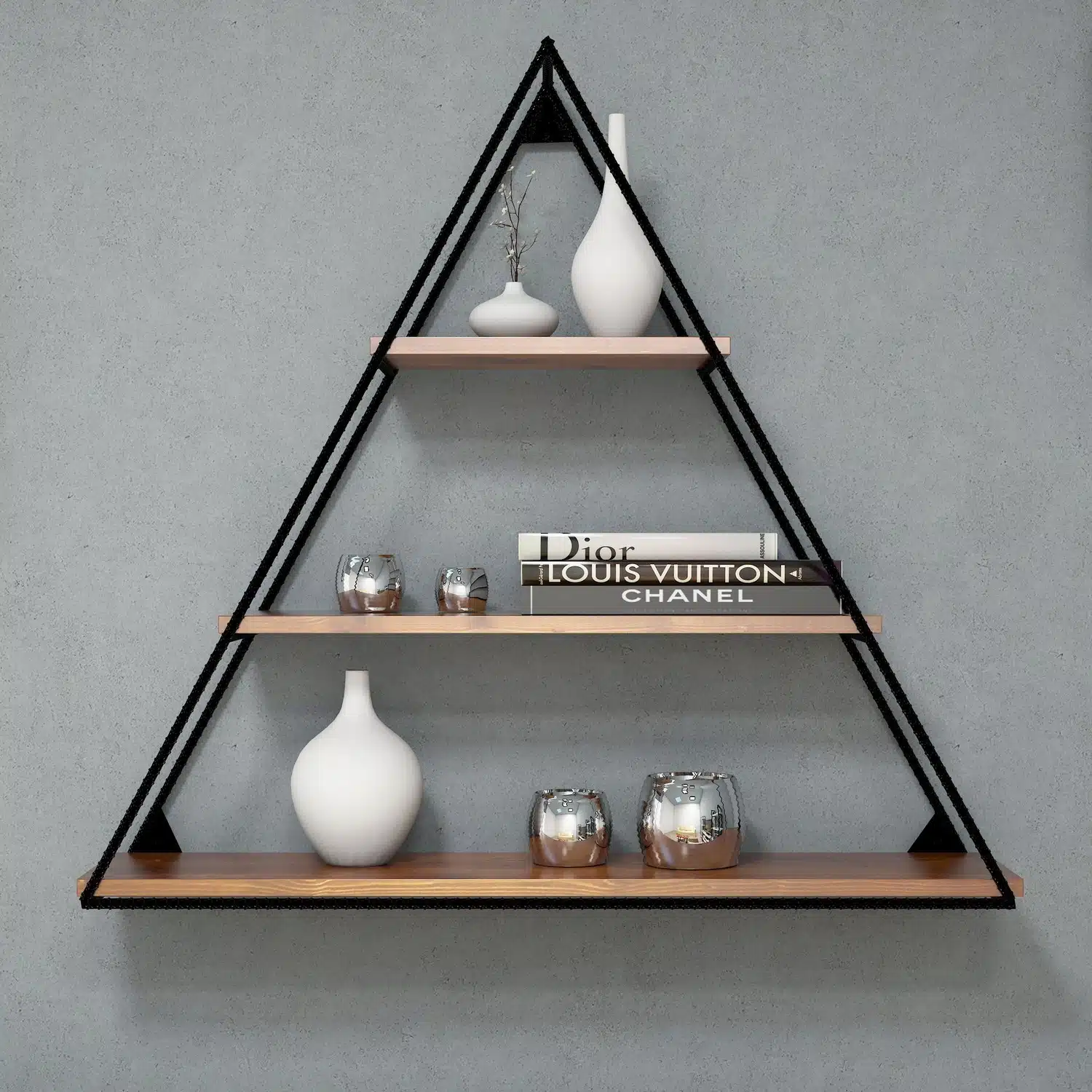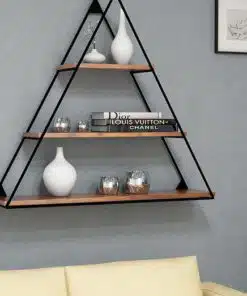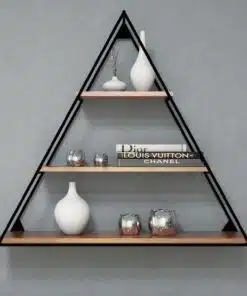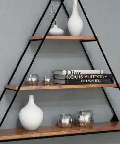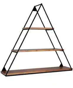 מדף מעוצב משולש עם 3 מדפים בגוון עץ עם מסגרת מפרזול שחור . פריט נהדר להנחת פרטי נוי ועיצוב הבית