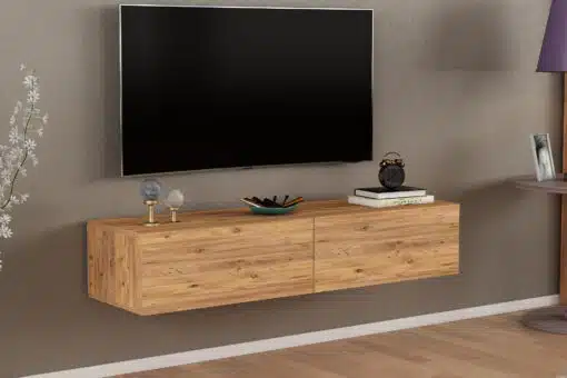 מזנון צף לסלון בגימור עץ עם קלאפות אחסון . המזנון מעוצב בסגנון מודרני וקווים ישרים ומתאים למי שמחפש עיצוב נקי ואלגנטי.