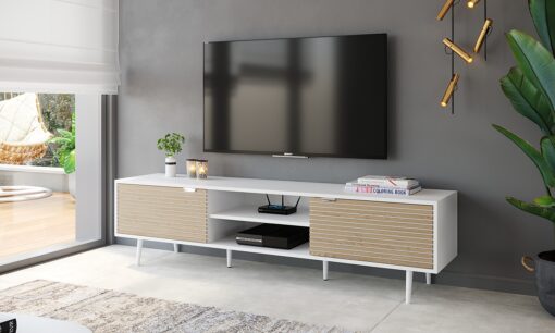 שידת טלוויזיה לסלון עם מדפי אחסון פתוחים ושני ארונות אחסון עשוי מעץ מתועש עם חיפוי מלמין יצוק.