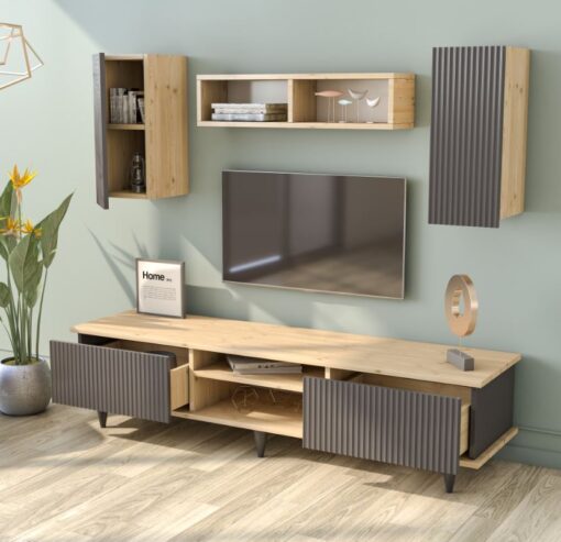 מזנון טלוויזיה מעוצב עם סט מדפים בגוון עץ משולב עם אפור