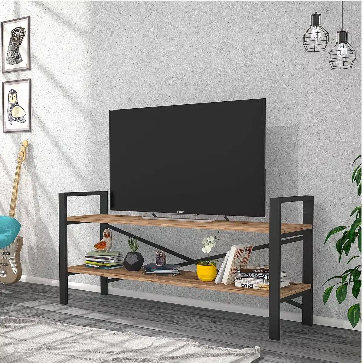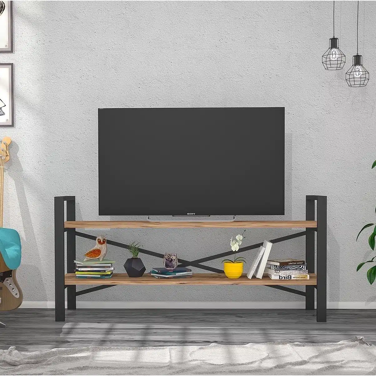 מזנון טלוויזיה מעוצב עם גוון עץ ופרזול
