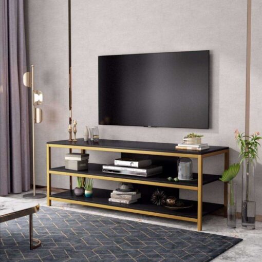 מזנון טלוויזה 140 ס"מ – מסגרת מוזהת עם מדפים שחורים