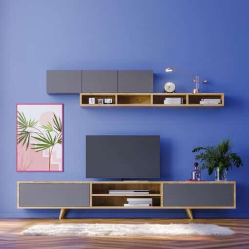 מזנון מודרני לסלון בעיצוב נקי וצעיר מגיע סט מדפים וקלאפת אחסון עליונה תואמת. המזנון עשוי מעץ מתועש עם חיפוי מלמין בצבע אפור משולב עם גוון עץ.