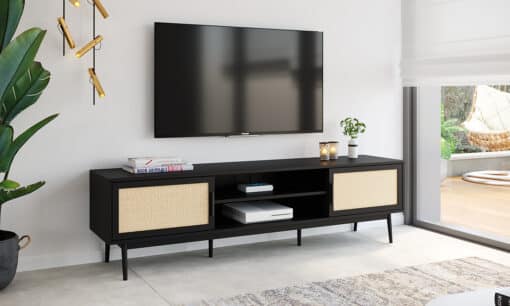 מזנון לסלון בצבע שחור ומשולב עם ראטן רוחב 180 ס"מ . המזנון עשוי מעץ מתועש עם חיפוי מלמין יצוק משולב דלתות דמוי ראטן בגוון טבעי.