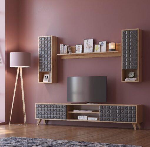 מזנון טלוויזיה מעוצב עם סט מדפים בגוון עץ משולב עם אפור