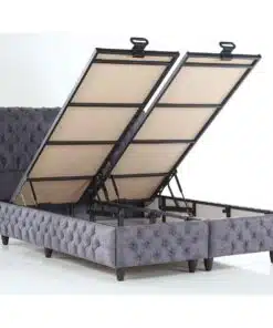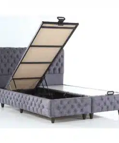 מיטה זוגית מרופדת בבד אפור איכותי עמיד וקל לניקוי. המיטה מרופדת בסגנון קאפיטונז' כפתורים צורת בצורת יהלום. למיטה שני ארגזי מצעים גדולים נוחים לאחסון מצעים או אחסון רב תכליתי נפתח בקלות עם מנגנון המופעל על ידי בוכנה. המיטה מחולקת לשני יחידות ומאפשרת ליצור מיטה יהודית .