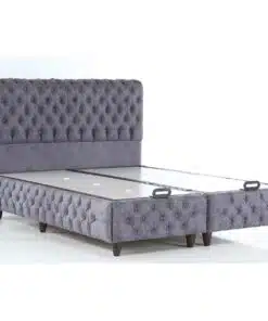 מיטה זוגית מרופדת בבד אפור איכותי עמיד וקל לניקוי. המיטה מרופדת בסגנון קאפיטונז' כפתורים צורת בצורת יהלום. למיטה שני ארגזי מצעים גדולים נוחים לאחסון מצעים או אחסון רב תכליתי נפתח בקלות עם מנגנון המופעל על ידי בוכנה. המיטה מחולקת לשני יחידות ומאפשרת ליצור מיטה יהודית .
