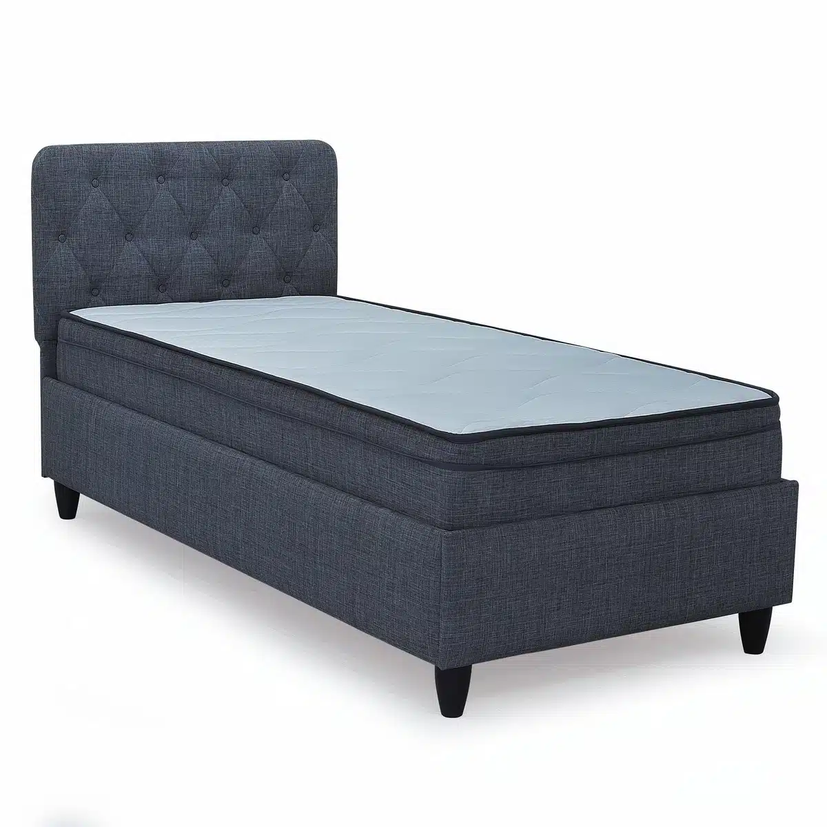 מיטת יחיד מרופדת בבד אפור בסגנון קפיטונאז' קוביות עם ארגז מצעים גדול . המיטה מרופדת בבד איכותי נושם וקל לניקוי , בבסיס המיטה ישנם פתחי אוורור ופתיחה קלה על ידי מנגנון הפתיחה לאחסון ונגישות לארגז האחסון.