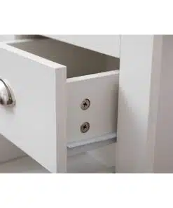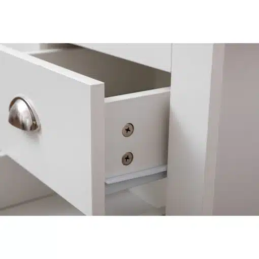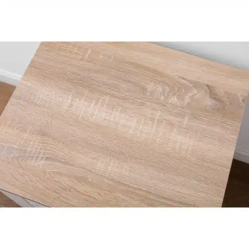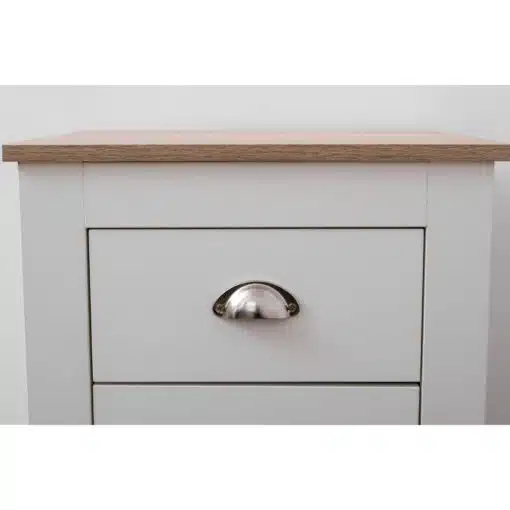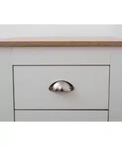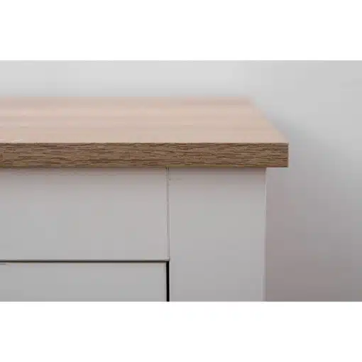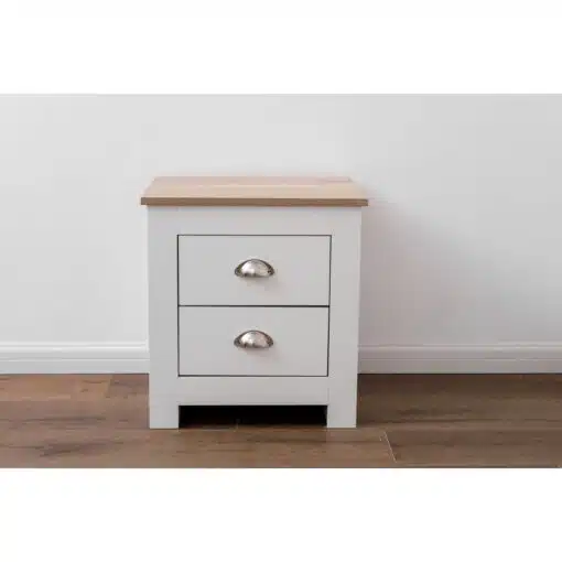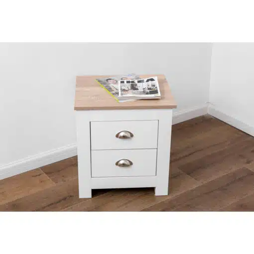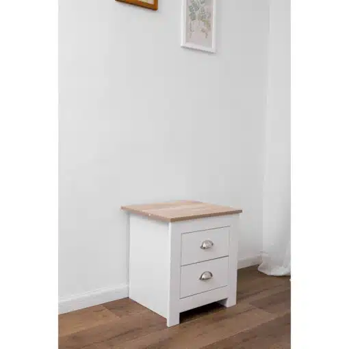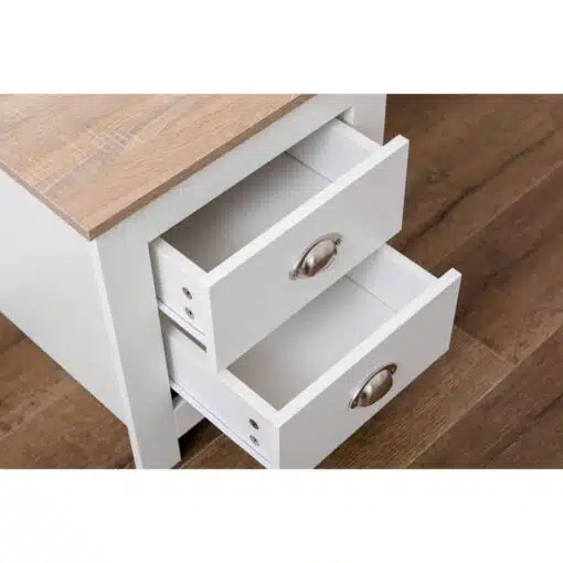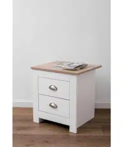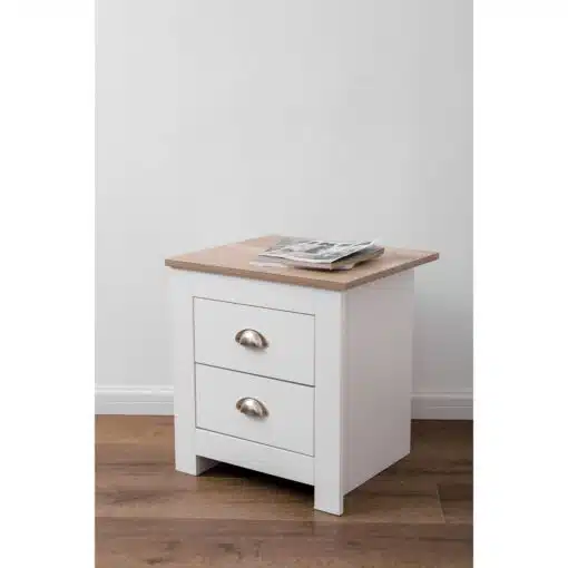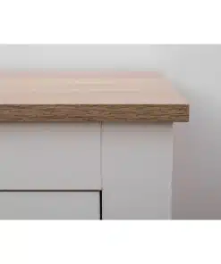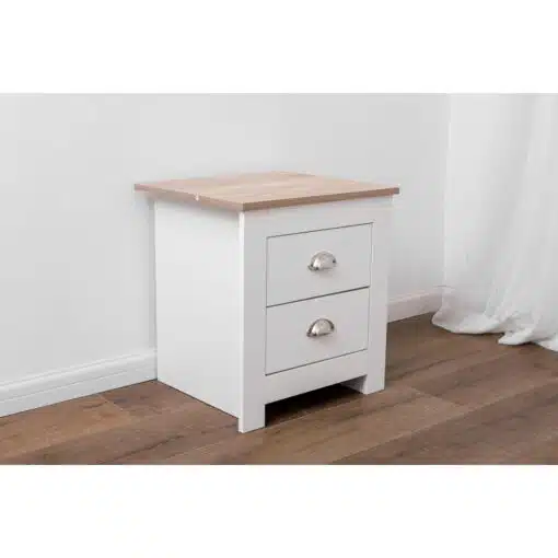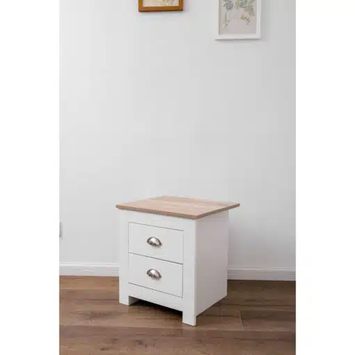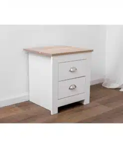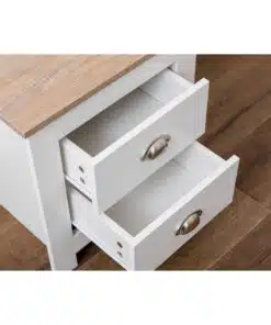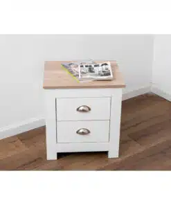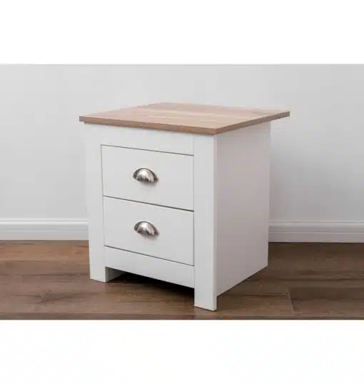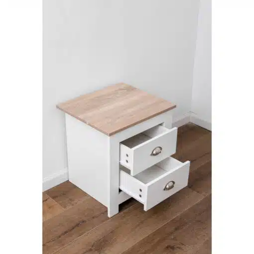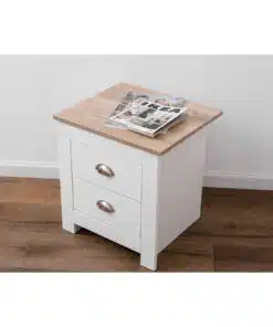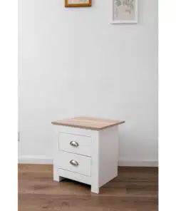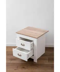 שידת לילה לבן משולב עם גוון עץ, עם שני מגירות אחסון, מעוצב בסגנון קלאסי. השידה עשויה משבבית דחוסה עם חיפוי מלמין איכותי ועמיד.