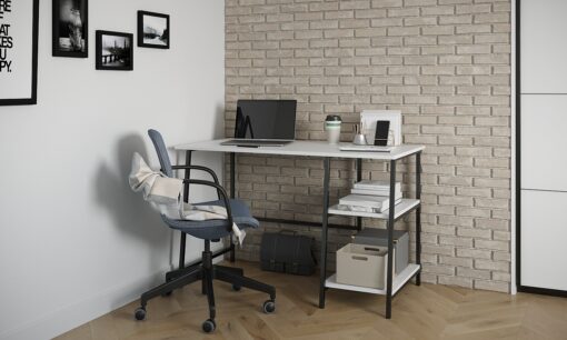 שולחן עבודה רוחב 120 ס"מ עם מדפי אחסון . השולחן עשוי מעץ מתועש עם חיפוי מלמין יצוק ומסגרת מתכת אל חלד בצבע שחור חזקה ויציבה.