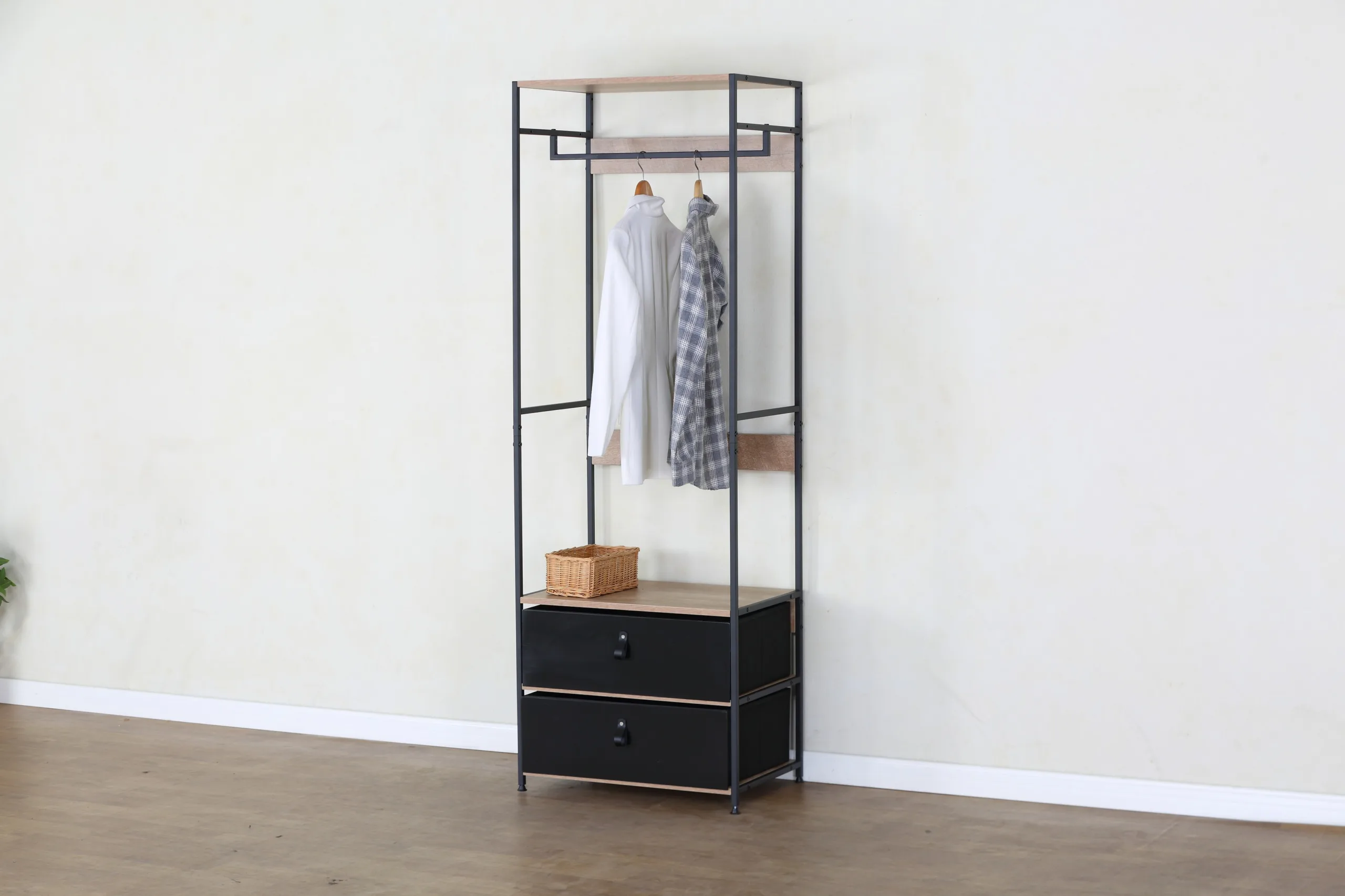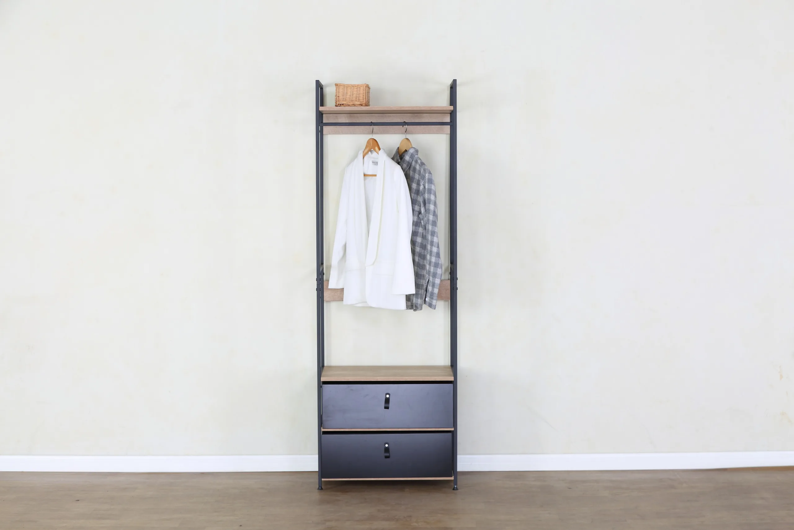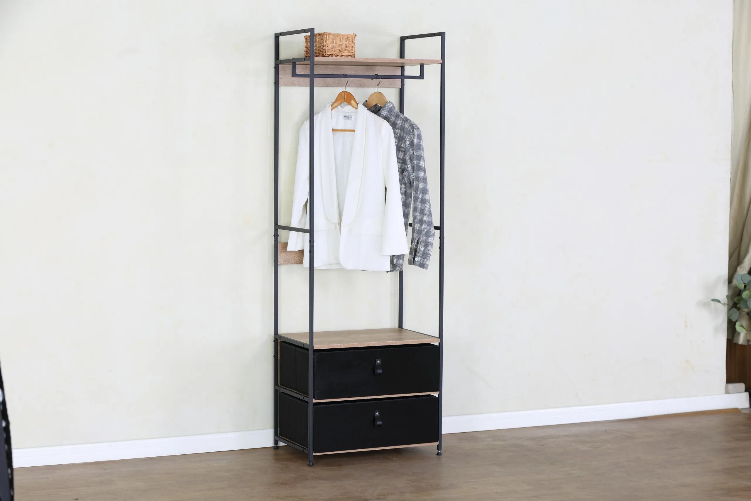 ✓ אחסון סגור ופתוח משולב – שתי מגירות מרווחות לאחסון סגור של לבנה, גרביים ואביזרים, ומוט תליה לבגדים, מספק פתרון שלם לכל צרכי האחסון במקום אחד