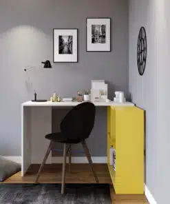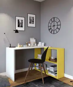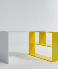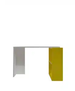 שולחן כתיבה משולב לבן וצהוב עם ספריית מדפים . השולחן עשוי משבבית דחוסה עם חיפוי מלמין איכותי ועמיד.