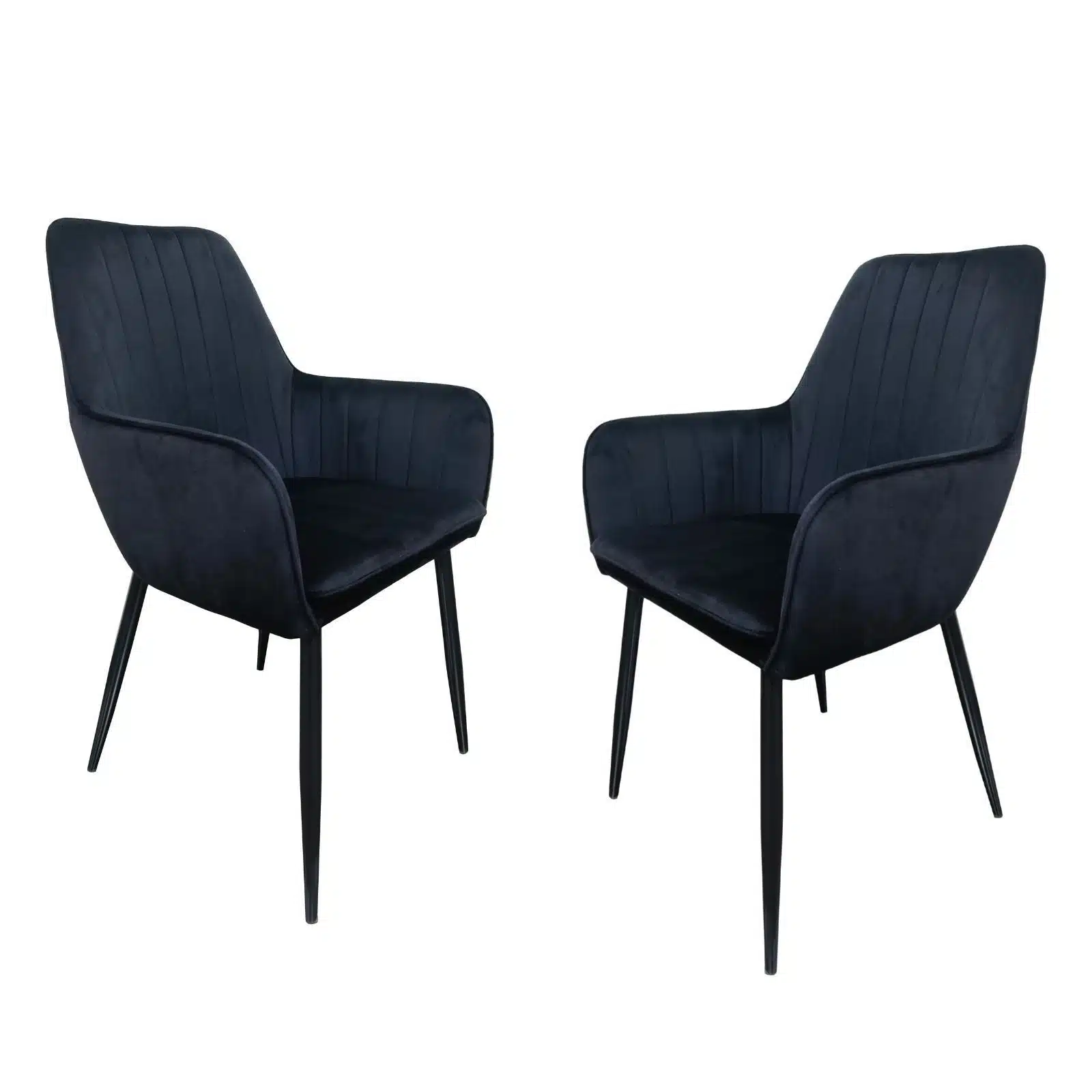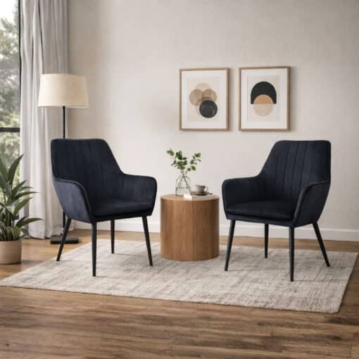זוג כורסאות קטיפה שחורות המשלבות אלגנטיות ורכות עם קווים מודרניים ונקיים. הכורסאות אידיאליות לסלון, חדר שינה או פינת ישיבה, ומספקות פתרון מושלם לישיבה יומיומית בבית.