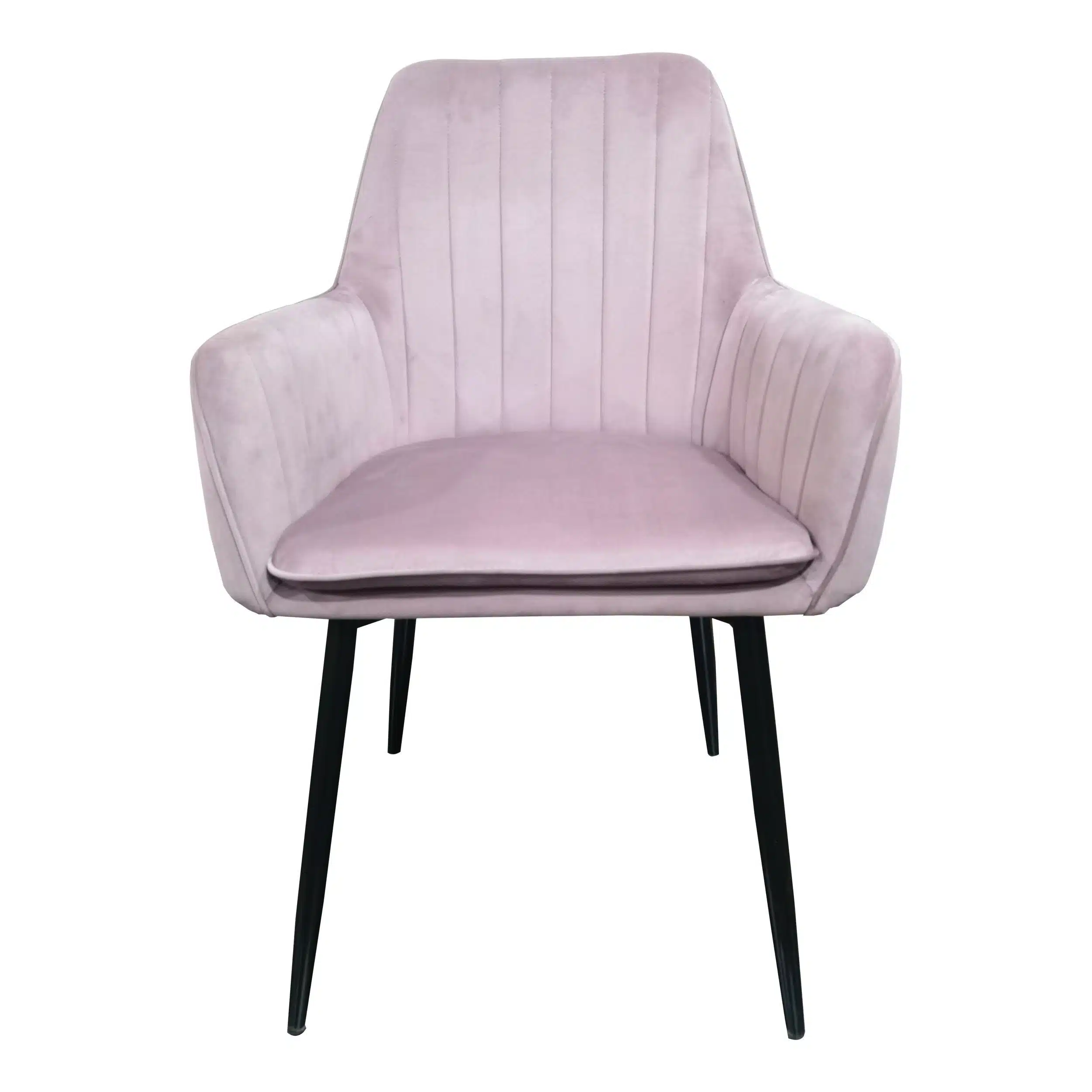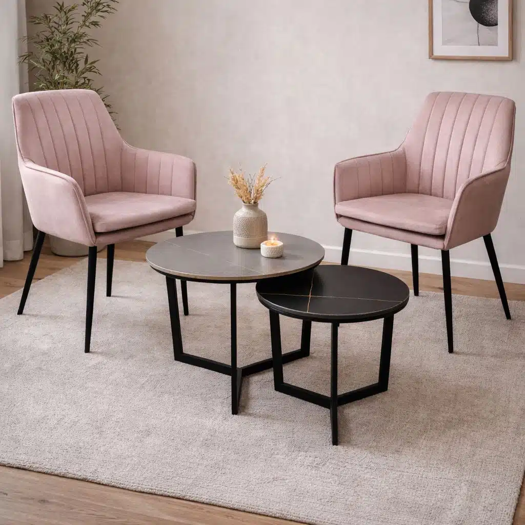 זוג כורסאות ישיבה מרופדות קטיפה בגוון ורוד עתיק עדין, המשלבות מראה רך ואלגנטי עם קווים מודרניים ונקיים. הריפוד עשוי בד קטיפה איכותי ונעים למגע, עם גב מעוצב בתיפורים אנכיים המעניקים תחושת יוקרה ועומק ויזואלי.