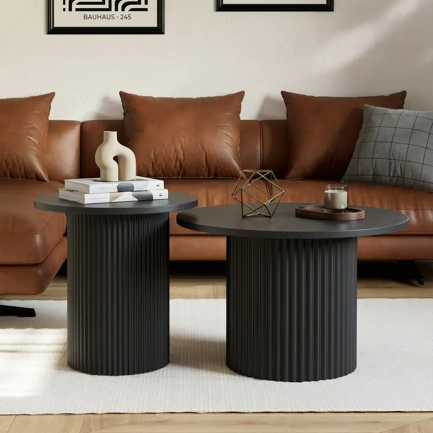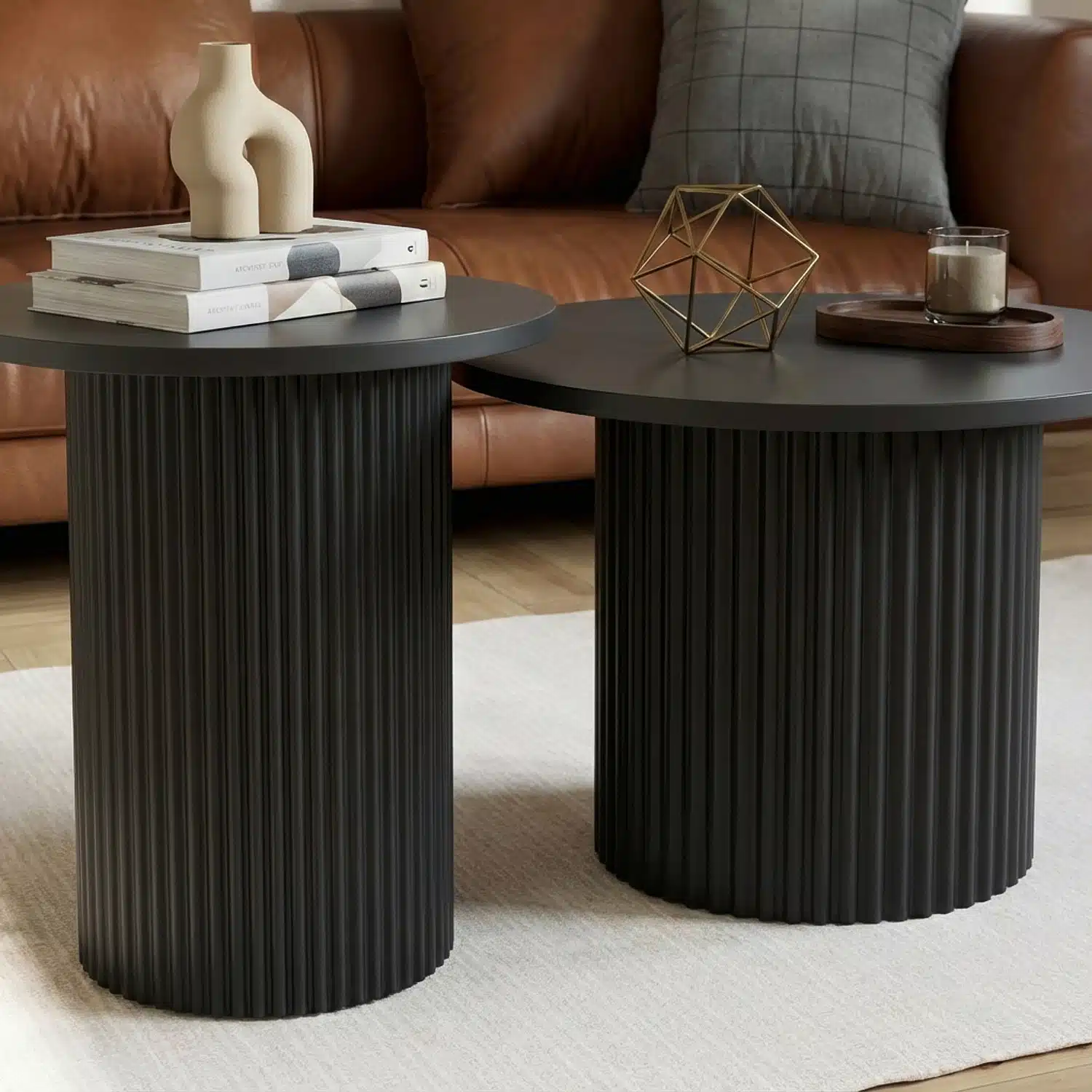 זוג שולחנות סלון אלגנטיים בעיצוב מודרני, המשלב משטח עגול חלק עם בסיס גלילי מחורץ ליצירת מראה יוקרתי ומרשים.